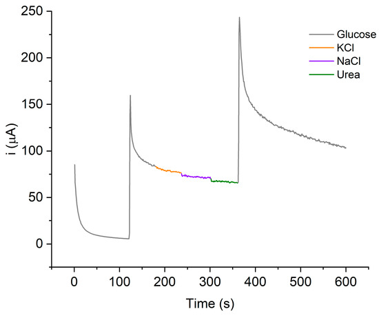 The selectivity CB-PANI.1-1/AgNP was evaluated as shown in Figure 9. This study was carried out using common interferents found in blood and biological fluids such as potassium chloride (KCl), sodium chloride (NaCl), and urea. A known concentration of the interferents was evaluated. The first signal appearing at 120 s of elapsed time corresponds to 5 mM glucose. After 60 s, KCl was added to the electrolyte; in this case, no change was recorded in the current signal. Approximately, at 240 s and 300 s of elapsed time NaCl and urea were added, respectively. In this case, the response of the material remained below 5% concerning the current recorded for glucose. The small change in current for these two interferents was attributed to (a) the interferent slightly blocking the surface of the modified electrode and then being diluted in the electrolyte and (b) the analyte being slightly diluted with the addition of the interferent. Finally, at 360 s of elapsed time, a second addition of glucose was added to the electrolyte, evidencing that the surface remains active for the detection of glucose; for this reason, it could be considered that the presence of these interferents does not affect the detection response.