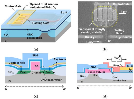 Figure 1 shows the SEM images and the schematic diagrams of the FET-type sensor. The sensor has four electrodes, including a drain, body, source, and control gate (CG), and an n+ polysilicon floating gate (FG) passivated by a SiO2/Si3N4/SiO2 (ONO) insulator stack. One end of the FG is located above the channel for controlling the concentration of carriers in the channel, and the other end extends 10 μm away from the channel to be capacitively coupled with the interdigitated CG. The sensing material is deposited on top of the coupling region of the two gates, which is enclosed by the dashed line in Figure 1b. The channel length and width of the FET platform are 2 μm and 2.4 μm, respectively. Figure 1c,d present the schematic diagram of the cross-section along A-A′ and B-B′ in Figure 1b. Due to the unique FG structure, the channels and oxides are effectively insulated from contaminants and molecules from the deposition of sensing materials as well as from the air.