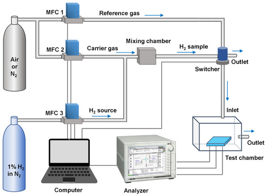 Figure 2 presents the experimental setup. During characterization of the hydrogen sensing performance of the sensor, dry synthetic air (20 vol.% of O2 and 80 vol.% of N2) was used as the reference and carrier gas to simulate the detection of H2 leaks in air environments. Hydrogen samples of various concentrations were prepared by mixing 1% H2 diluted in N2 (with an uncertainty of 2%) with synthetic air with MFC 3 and MFC 2; at the beginning, a reference gas of 400 sccm controlled by MFC 1 was blown onto the sensor, and when the tests of the gas concentration response were initiated, the reference gas was switched to a hydrogen sample of a certain concentration at 400 sccm. In addition, the effect of O2 on the H2 detection characteristics was also investigated in this paper. During this test, the reference and carrier gases were all replaced with N2, and the H2 sensing characteristic tests were repeated. All tests were conducted using an Agilent B1500A at room temperature.