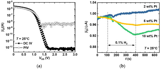 The basic electrical and sensing properties of the FET-type sensor are shown in Figure 3. Figure 3a shows the double-sweep pulsed IV (PIV) and DC IV curves measured at room temperature. Figure 3b illustrates the response of the sensor with different Pt concentrations (2 wt.%, 5 wt.% and 10 wt.%) to 0.1% H2 when a DC bias was applied to the electrodes. The response (R) of the sensor is defined as the following (Equation (1)):