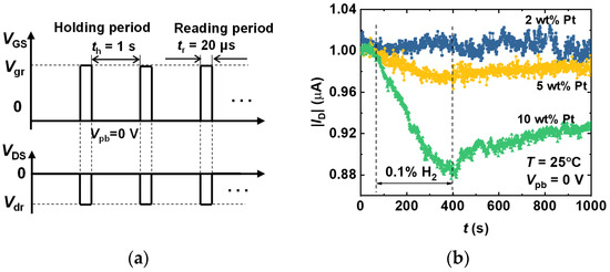 To suppress the current drift, a pulse biasing scheme that continuously alternated between pre-biasing the gate and reading the drain current of the FET-type sensor was designed, as shown in Figure 4. Figure 4a shows the pulse schemes applied to CG (upper) and D (lower) electrodes. The pulse cycle of the scheme was divided into a holding phase (th) and a reading phase (tr). During th, a prebias voltage (Vpb) was applied to the CG, which equals zero in Figure 4 (VCG = Vpb = 0 V), and the D was grounded (VDS = 0 V). In this period, the drain current was not recorded, so unwanted power consumption was removed. During the tr phase, the VCG and VD values were simultaneously set to Vgr and Vdr, respectively, and the drain current values were recorded to form a discontinuous sensing signal. Here, th and tr were set to 1 s and 20 µs, respectively. In Figure 4b, transient responses of the FET-type sensors are plotted as a parameter of Pt wt.% at room temperature. The drift caused by charge trapping is eliminated, since tr is applied for a shorter duration than the charge trapping time. The results illustrate that the sensor based on a 10 wt% Pt sensing layer has the highest hydrogen response.