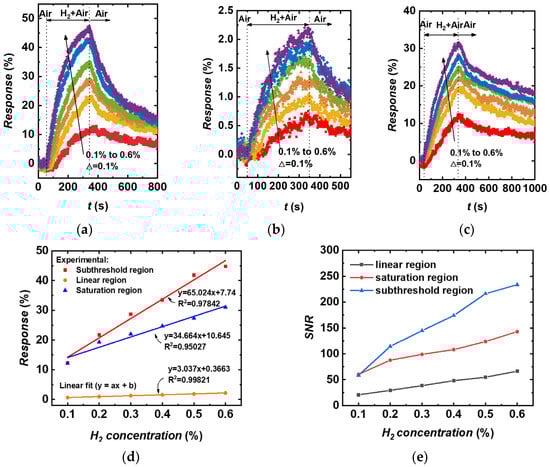 The calculated SNR versus H2 concentration was plotted and is shown in Figure 5e. As the H2 concentration increased, the SNR of the sensor increased in all three operating regions, but all SNRs for the subthreshold region were higher than those for the other two regions. The DL of the sensor is calculated using Equation (4) [26].