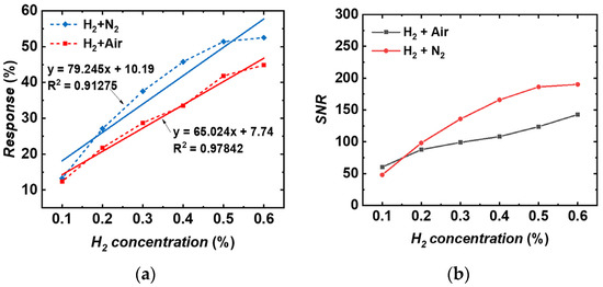 Based on Equations (1) and (4), the R and SNR values were also calculated for the N2 case and plotted together with the results of synthetic air case, as shown in Figure 7a,b for comparison. The R and SNR of the sensor in the H2 concentration variation range of 0.1% to 0.4% were significantly improved when N2 served as the carrier and reference gas, but the R of the sensor appeared to be saturated when the H2 concentration reached 0.5%. This phenomenon can be explained by the fact that the number of hydrogen molecules is retained without the consumption of O2, but at the same time, the presence of large quantities of hydrogen molecules causes the sensing material to become saturated very quickly. In other words, the number of oxygen ion species adsorbed on the surface of the sensing material in advance is not sufficient to detect more H2. The DL of the sensor tested in this section was also calculated according to Equation 4. If the relationship between the response and concentration is fitted linearly over a range of hydrogen concentrations from 0.1 to 0.6%, the slope is 79 in Figure 7a and the DL is 104 ppm. However, if the response–gas concentration relationship is fitted linearly over the 0.1–0.4% concentration range, the slope is 108 and the DL is 77 ppm, considering that the response of the sensor saturates when the hydrogen concentration reaches 0.5%. It is suggested that the H2 sensing performance of the sensor in N2 will be enhanced if more oxygen ion species can be introduced onto the surface of the sensing material during device preparation.
