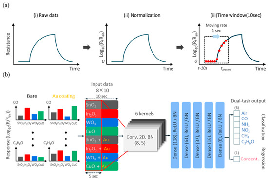 (a) Schematic illustration of the sensing data preprocessing; (b) structure of the convolutional neural network for gas species recognition. Reprinted with permission from [133]. Copyright © 2022, American Chemical Society.