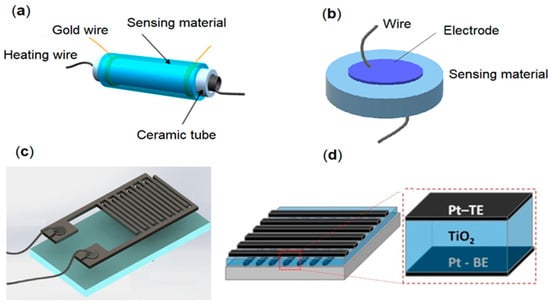 Configurations of the electrodes used in metal oxide-based gas sensors: (a) Cylindrical. Reprinted with permission from [152]. Copyright Creative Common CC BY license; (b) disk-type; (c) interdigitated; Reprinted with permission from [16]. Copyright Creative Commons Attribution 4.0 International License; (d) memristor-type. Reprinted with permission from [153]. Copyright @ 2017 Elsevier B.V.