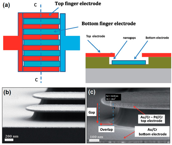 Interdigitated nanogap electrodes: (a) Overview and cross-section; (b,c) SEM images of the bottom and top electrodes. Reprinted with permission from [162]. Copyright @ CC BY 3.0.