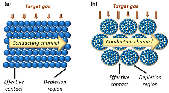 Schematic of SnO2 films of different morphologies: (a) small nanoparticles film; (b) big cluster film. Adopted from [175].