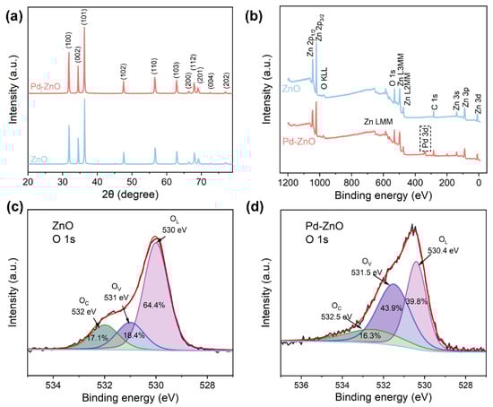 (a) XRD patterns of ZnO and Pd-ZnO. (b) XPS full spectrums of ZnO and Pd-ZnO. O 1s spectrums of (c) ZnO and (d) Pd-ZnO.