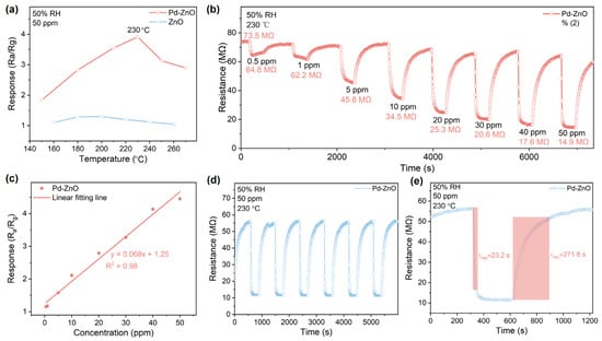 (a) Gas response values of ZnO and Pd-ZnO sensors toward 50 ppm NH3 at different working temperatures. (b) Resistive response and recovery curves of Pd-ZnO sensor for 0.5–50 ppm NH3. (c) Linear fitting line of response and NH3 concentration. (d) Repetitive response and recovery curve at 50 ppm NH3. (e) Response and recovery times at 50 ppm NH3.