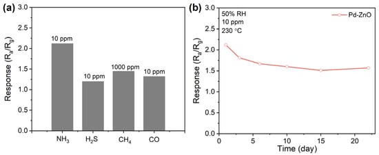 Although the comfortable environment humidity is about 50% RH, the humidity in the environment is variable. For this reason, the resistive response and recovery curves of the Pd-ZnO gas sensor for 50 ppm NH3 were tested under different RHs, as shown in Figure 5a. Under low humidity (10% and 30% RH), the recovery speed of the sensor is slow and incomplete. To observe changes of baseline and response resistance values, Figure 5b shows the base and response resistance curves of the Pd-ZnO gas sensor. As the RH increases, the baseline resistance of the sensor decreases due to the adsorption of water molecules [42]. More intuitively, Figure 5c shows the response and recovery curves from resistive response and recovery curves in Figure 5a. Correspondingly, the response values of 50 ppm NH3 under different RHs are shown in Figure 5d. Overall, within a wide humidity range of 10–90% RH, although the response of the Pd-ZnO gas sensor decreases due to the competitive adsorption of water molecules, the change is not significant, and it exhibits a good humidity resistance. Figure 6 shows that the Pd-ZnO gas sensor has certain selectivity and long-term stability. Selectivity is a major challenge faced by metal oxide semiconductor gas sensors, including ZnO, and we need to continuously seek solutions.