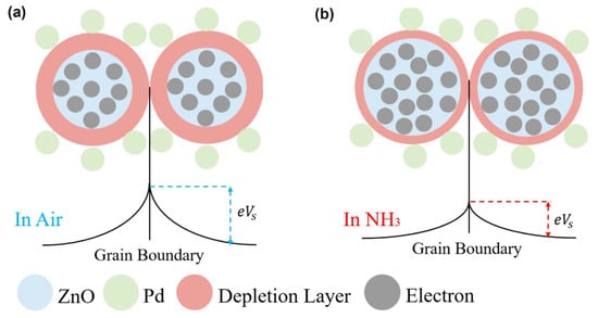 Schematic diagrams of the space charge layer changes of Pd-ZnO gas sensor. (a) In air and (b) In NH3.