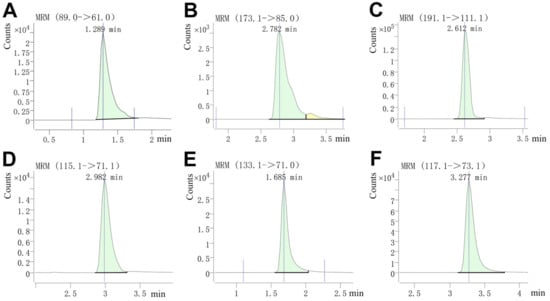 The optimal condition parameters are given in Table 3, and the ion spectra of six compounds’ MS products are shown in Figure 1. These results indicated that the quantitative analysis of six organic acids could be realized by using ESI- and the multi-reaction ion monitoring (MRM) mode of the electric spray ion source.