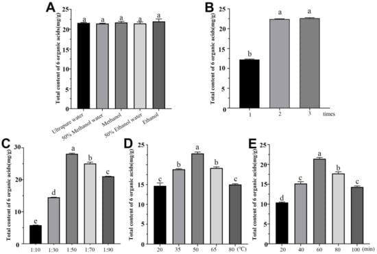 The total content of six organic acids was examined by a single factor. (A) Extraction solvent. (B) Extraction repetition. (C) Solid-liquid ratio. (D) Extraction temperature. (E) Extraction time. Treatments with the same letter are not significantly different from each other at an alpha level of 0.05 (LSD post hoc test).