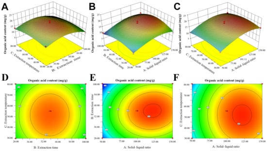 Response surface plots of the combined effects of the factors and the response variable (total yield of six organic acids) in 3D and 2D. (A,D) Extraction temperature and extraction time. (B,E) Extraction time and solid–liquid ratio. (C,F) Extraction temperature and solid–liquid ratio. (A–F): The change from blue to red in the figure indicates that the extracted organic acid content goes from low to high. The red dots represent the positions of the surrounding and central points.