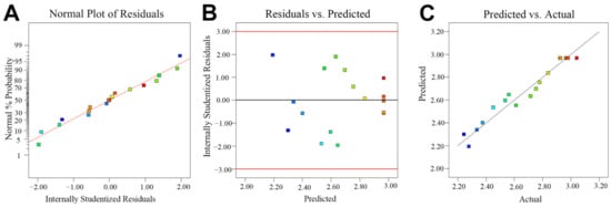 RSM model with tested variables. (A) The normal probability distribution of the residual. (B) The distribution of the residual and predicted values. (C) The residual and predicted value. (A–C): Different colored squares in the figure represent the 17 runs in RSM.