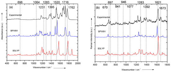 Experimental and theoretical (BPW91 and B3LYP) FT-IR (a) and Raman (b) spectra of cefoperazone. The FWHM of the theoretical spectra is 4 cm−1.