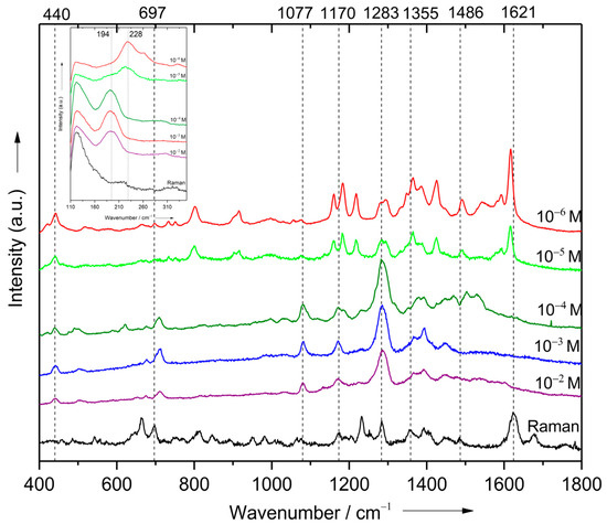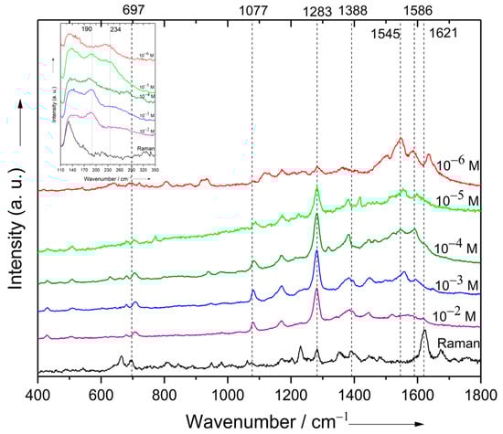 The SERS spectra are directly dependent on the concentration of the antibiotic in an aqueous solution. Changes associated with the concentration modifications are due to a reorientation of the adsorbed molecules with respect to the metallic surface or to different interactions between the analyte and the nanostructured surface [38,39,40,41]. A selection of the enhanced Raman bands with the corresponding vibrations is summarized in Table 3.
