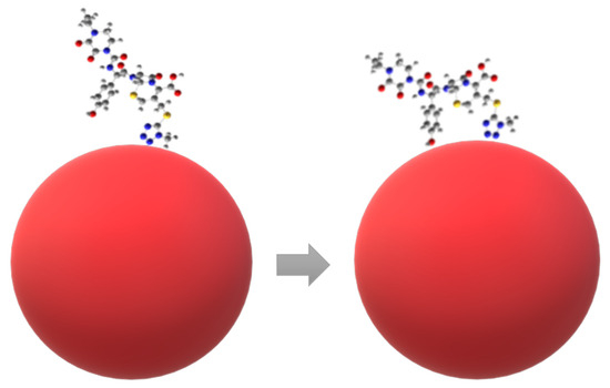 On the other hand, as mentioned earlier in this paper, the β–lactam ring plays a major role in the destruction of the cellular wall of the bacteria. The carboxylate group was reported to manifest chemisorption to the silver colloid in the case of benzylpenicillin [50]. However, in our case, the molecule chemisorption seems to take place through the nitrogen ring. If the adsorption to the nanoparticle does not interfere with the β–lactam group, it means that the binding of cefoperazone to both the metallic nanoparticle and the bacteria can take place. The implications of this double binding could lead to a boost in the antibacterial effect of cefoperazone, as the whole antibiotic–nanoparticle complex would act against the bacteria.