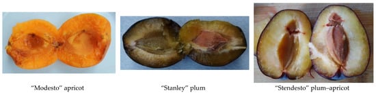Fruit consumption is highly associated with lower risks of non-communicable diseases due to the presence of various bioactive molecules []. The genus Prunus is widely known for its delicious fruits. The apricot fruit is characterized with not only a distinct flavor and odor but also a variety of health-enhancing compounds like phenolic compounds and carotenoids []. Worldwide, all cultivated apricots originate from only one species—the Prunus armeniaca L., and, according to authors, apricot varieties are categorized into four eco-geographical groups, namely Central Asia, Europe, Iran-Caucasus, and Dzhungar-Zailing []. The plum is another cherished representative that is used to boost intestinal health and is reported to contain many antioxidant substances in addition to organic acids, vitamins, minerals, and sugars []. The European plum (Prunus domestica L.) and the Japanese plum (Prunus salicina L.) are differentiated based on their origin and domination in contemporary commercial production []. The apricot and the plum fruits are successfully crossed in hybrids that can resemble either the plum or the apricot more. The “Stendesto” is currently the only successful Bulgarian plum–apricot hybrid. It is a plumcot, meaning it looks more like a plum on the outside. The “Stendesto” is currently not well studied and rarely promoted to countries outside Bulgaria.