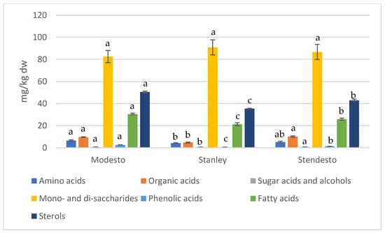 Distribution of chemical classes in studied fruit samples (mg/kg dw). Different letters in the same chemical class indicate statistically significant differences (p < 0.05), according to ANOVA and the Tukey test (n = 3).