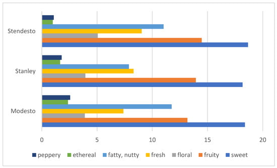 The “Modesto” apricot was characterized with predominantly sweet volatiles, followed by fruity and fatty/nutty associations. The “Stanley” plum was mainly sweet and fruity, with fresh sensory relations. The “Stendesto” plum–apricot hybrid appeared to have a more distinct fruity, fresh, and floral profile compared with its parents. It had fewer ethereal, peppery, and fatty/nutty notes. The quantity of fruity volatiles was comparable in all three fruit samples.