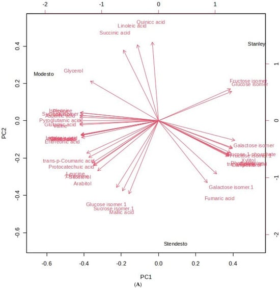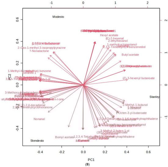 Principal component analysis of fruit samples. Eigenvector loading values of compounds: (A) primary metabolites and (B) VOCs.