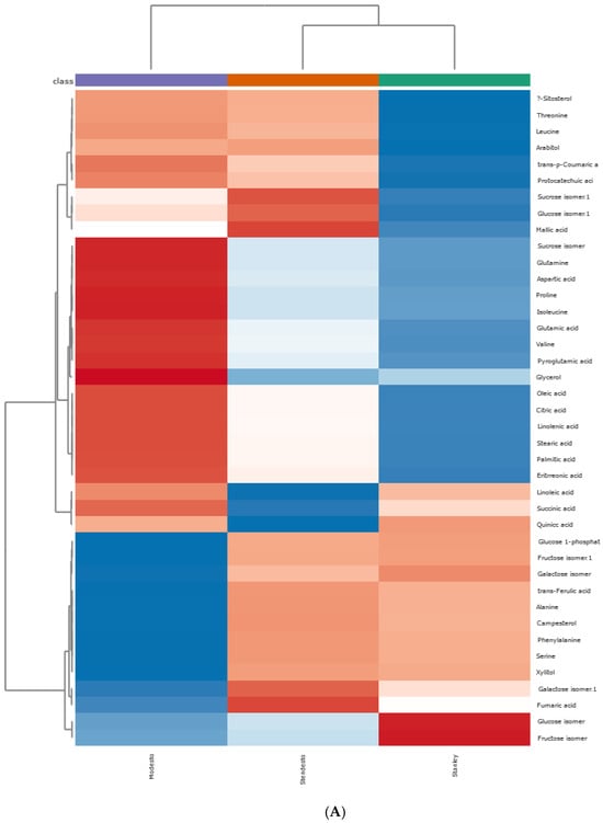 The chemical and volatile compositions were evaluated using principal component analysis (PCA) and further studied to observe separate groups using hierarchical cluster analysis (HCA). As shown in Figure 5A (metabolites), two principal components were generated in the PCA with an eigenvalue of greater than one, accounting for 74.6% (PC1) and 25.4% (PC2) of the total variance, whereas in Figure 5B (VOCs), the distribution for PC1 was 54.5% and for PC2—45.5%. Hexyl acetate, 2-ethyl hexanol, and (E)-2-hexenal are arranged most positively, whereas nonanal and 2.2,6-trimethylcyclohexanone contributed most negatively. Additionally, fructose and glucose isomers contributed most positively, compared with fumaric acid and galactose isomer contributing most negatively.