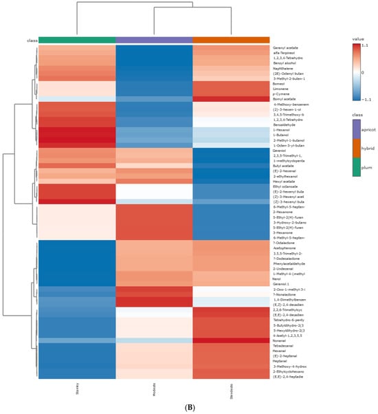 Three major chemical groups are reported to be commonly identified in various fruits: alcohols, aldehydes, and esters []. The investigated volatile compounds in the three studied fruits (plum, apricot, and hybrid) are presented in Table 2. The identified compounds were profiled as alcohols, aldehydes, esters, lactones, ketones, terpenoids, and benzene derivatives. All of the identified compounds were present in the plum–apricot hybrid fruit; this was not valid for the plum or for the apricot. Only a few benzene derivatives were identified in the “Modesto” apricot, and none of the three lactones was present in the “Stanley” plum.