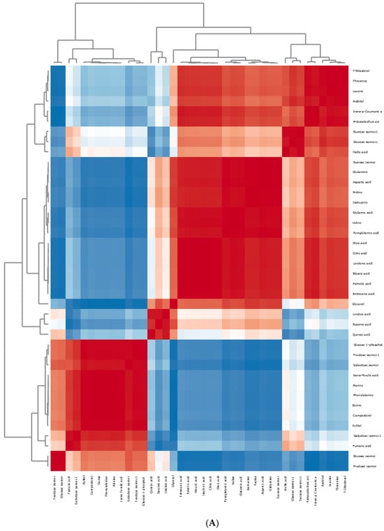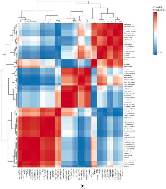 Pearson’s correlation heatmaps of the different compounds in studied fruits: (A) primary metabolites and (B) VOCs. The values were normalized by log10 transformation.