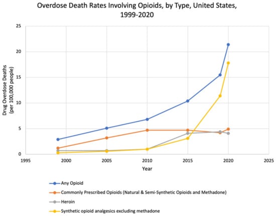Opioid overdose has exploded at an alarming rate in the past few decades, with exponential increases in overdose leading to nearly 91,799 fatalities in 2020 and 106,699 in 2021 [,,,,,,]. The Centers for Disease Control and Prevention data of drug overdose deaths [] involving opioids in the United States between 1999 and 2020 are shown in Figure 1. Other challenges of opioid overdose challenges include withdrawal management, costing billions of dollars of taxpayers’ money to rehabilitate or care for drug abusers [,,,]. Opioid dependency also has negative impacts on the global workforce and human resources, [] and is detrimental to the fabric of family structures []. Additionally, areas where abuse is prevalent also have increased crime rates, which promote societal disorderliness that threatens public safety []. Opioid abuse and related challenges are also responsible for tens of thousands of deaths globally each year [,,,,,,,,,].