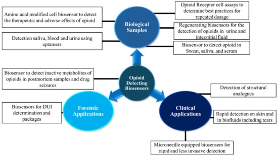 The development of biosensors plays a pivotal role in the detection and monitoring of opioids due to their widespread use as prescription pain medications and recreational analogs. The effectiveness of their use as a method of pain management is counteracted by the narrow therapeutic window of use, which widens the threshold of abuse. Compared to traditional detection methods, such as spectroscopic methods, biosensors offer rapid, simple, sensitive, and specific analyte detection. The fast production of analogs necessitates continual development of detection methods to keep up with the rapidly increasing number of newly emerging variants. Additionally, the increase in opioid overdoses worldwide pointedly marks the need for sensors that both researchers and the general public can use for a wide range of applications, which include but are not limited to assessing evidence in drug-related deaths or crimes, tools needed for users to test their product for unwanted additions, the ability of first responders to determine the safety of a drug-related emergency, or for TSA workers to test the safety of incoming cargo as the potency of some of the opioid analogs pose significant health risks upon exposure. This section of the review offers a brief survey of novel efforts in developing biosensors for detecting pharmaceutical and illicit opioids in biological samples, pharmacological, forensic, and clinical applications, as presented in Figure 4.