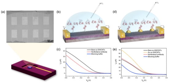 Norfentanyl antibody-functionalized SWCNT-based FET biosensor. (a) Top: optical image of the sensing chip with 8 devices. Bottom: the sensing chip was wire-bonded in a package for measurements. (b) Schematic illustration of a norfentanyl antibody-functionalized SWCNT-based FET biosensor via direct coupling approach. (S: source; D: drain.) (c) FET transfer characteristics of each functionalization step using a direct coupling approach. (d) Schematic illustration of a norfentanyl antibody functionalized SWCNT-based FET biosensor via the AuNP approach. (e) FET transfer characteristics of each functionalization step using the AuNP approach. Published with permission from Ref [].