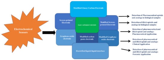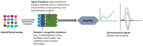 Electrochemical sensors have become crucial analytical techniques for opioid analyses with desirable advantages. Nevertheless, these sensors require accurate calibration to minimize interference from complicated sample matrices, and, sometimes, the potential can drift after a while. Moreover, the electrodes must often be modified to ensure specificity towards specific analytes [].
