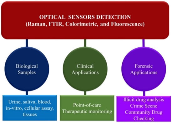 This review section discusses and highlights the advances in the use of optical sensors for opioid analysis and pharmaceutical, clinical, and forensics applications. Figure 8 presents the primary optical sensors and their applications for biological sample analysis and clinical and forensic applications highlighted in this review section.
