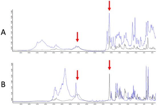 Sample drug-checking FTIR spectra. Drug-checking samples (blue) are overlaid with the fentanyl hydrochloride spectrum (black). The drug sample in (A) is an illicit opioid mixture containing fentanyl, caffeine, and mannitol. The drug sample in (B) is methamphetamine with no fentanyl present. The red arrows indicate characteristic peaks of fentanyl hydrochloride that are recognizable when present in drug mixtures. Reprinted with permission from reference [].