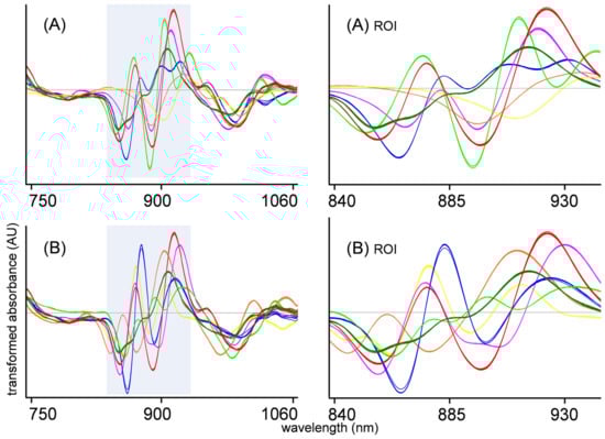 The initial process in cocaine detection by NIR spectra machine learning involves employing NIR spectra preprocessing using various strategies, including k-NN sub-models, spectra derivatives, and PCA, to remove outliers and enhance the detection of substances and the model’s predictive ability for cocaine. In general, better cocaine detection was recorded using a small window (740–1070 nm) of NIR spectra wavelength regions. Figure 11 shows the preprocessed NIR spectra wavelength region corresponding to cocaine detection.