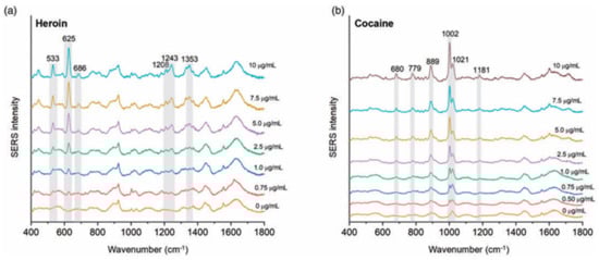 - Wang, L.; Vendrell-Dones, M.O.; Deriu, C.; Dogruer, S.; Harrington, P.B.; McCord, B. Multivariate analysis aided surface-enhanced Raman spectroscopy (MVA-SERS) multiplex quantitative detection of trace fentanyl in illicit drug mixtures using a handheld Raman spectrometer. Appl. Spectrosc. 2021, 75, 1225–1236. [Google Scholar] [CrossRef] [PubMed]