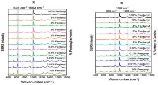 The minimal or no sample preparation, small sample size, nondestructive nature, rapidity, and versatility of FTIR spectroscopy allow for the detection of opioids and illicit drugs in samples of varying matrices. The attractive properties of FTIR spectroscopy make it ideal for the rapid detection of opioids and illegal drugs at point-of-care drug-checking and community services drug analysis. McCrae et al. demonstrated the potential use of FTIR spectroscopy in combination with immunoassay strips for the detection of fentanyl at a point-of-care drug-checking in Canada []. The study analyzed 283 volunteer drug samples and analyzed fentanyl using FTIR spectroscopy. The drug samples were further sent for quantitative nuclear magnetic resonance (qNMR) analysis and immunoassay strip testing for laboratory confirmatory testing. A total of 173 out of 283 (or 61.1%) of the samples tested positive for fentanyl. qNMR detected fentanyl concentrations ranging from 1% to 91% by weight. However, FTIR could not detect fentanyl in 30/173 (or 17.3%) samples containing fentanyl concentrations ≤ 10%. In addition, the immunoassay strip testing failed to detect fentanyl in 4 out of 173 (or 2.3%) samples containing fentanyl concentrations ≤ 5%. In addition, the study reported the ability of FTIR spectroscopy to detect fentanyl in liquids, pebbles, powders, granules, and crystal samples, showing the versatility of FTIR spectroscopy for drug detection.