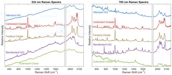 - Wang, Y.; Sheng, W.; Liu, X.; Guo, J.; Zhang, X.; Qi, X.; Zou, M.; Wang, C. The detection of 27 fentanyl compounds in solid and liquid drugs based on differential Raman spectroscopy. Chemosensors 2023, 11, 561. [Google Scholar] [CrossRef]