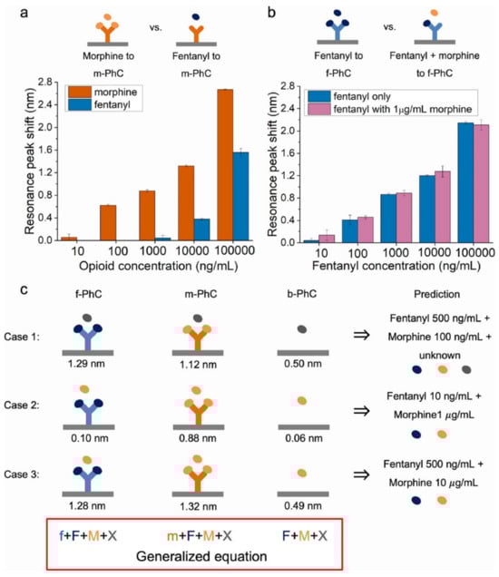 In 2023, Nah and coworkers [] fabricated an optical sensor functionalized with one-dimensional photonic crystals (1D PhCs), comprised of two dielectric materials with low and high refractive indexes. This property allows for band gaps, which are capitalized upon by targeted layering patterns, the addition of an absorbing layer at the bottom, and the incident angle of light. The combination of these elements in the fabrication allows for the bandgaps created by the material to reflect light at each wavelength, resulting in the acquisition of a single resonance peak and facilitating the detection of the antibody–antigen binding through shifts in the resonance peaks. The sensor was demonstrated to have a broad working range of 10 ng/mL to 1 mg/mL. The minimum effective plasma concentration of morphine is 20–40 ng/mL, and the lethal dose is 0.5 mg/mL, which means that the sensor can effectively detect relevant points on concentration in the blood. Fentanyl dosage is much more potent, as the lethal dose is about 7 ng/mL, but the LOD of the fentanyl sensor is just below that threshold at 6 ng/mL, which is an improvement over previous work. Therefore, future work is needed to improve the detection of fentanyl. The authors also demonstrated the sensor’s ability for multiplexing when multiple fluidic channels were functionalized with the prepared antibodies. They could subtract the background signals to quantify the concentrations of the two analytes in the sample, highlighting the device’s applicability in analyzing unknown mixtures.