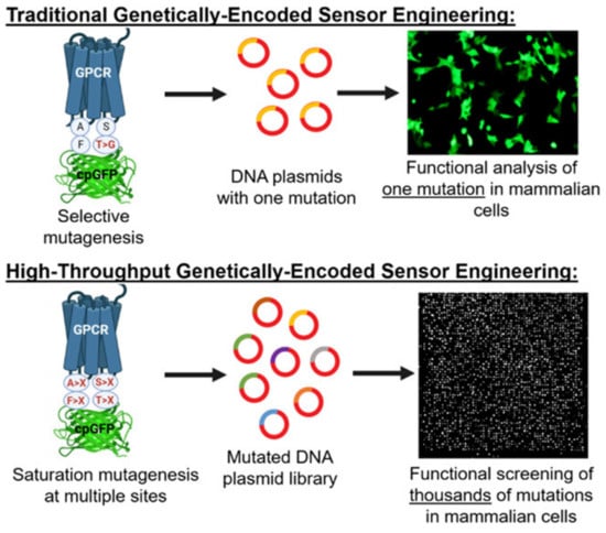 - Rappleye, M.; Wait, S.J.; Lee, D.J.; Siebart, J.C.; Torp, L.; Smith, N.; Muster, J.; Matreyek, K.A.; Fowler, D.M.; Brendt, A. Optogenetics Microwell Array Screening System: A High-Throughput Engineering Platform for Genetically Encoded Fluorescent Indicators. ACS Sens. 2023, 8, 4233–4244. [Google Scholar] [CrossRef] [PubMed]