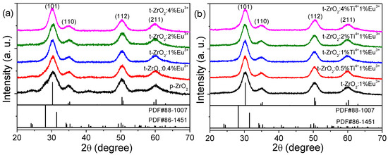 At present, many solution-based synthesis techniques including precipitation, sol-gel, pyrosol, pyrolysis, sonochemical, hydrothermal, and solvothermal processes have been developed for ZrO2 nanoparticles during the past few decades [14,15,16,17,18,19,20,21,22,23,24,25,31,32,33], which are favorable for controlling the size, morphology, and surface chemistry of the resulting product. Herein, a facile solvothermal method was adopted to prepare the pristine, Eu3+ singly doped and Ti4+/Eu3+-co-doped ZrO2 NCs using alkoxide precursors as the Zr source and n-butoxide as solvents. Figure 1 shows the powder XRD patterns of the as-obtained nanoparticles. Broad reflection peaks were observed in all of the samples, indicating a smaller crystallite size. Phase purity was examined upon indexing the reflection peaks to the standard patterns; a mixed phase of the predominant t-ZrO2 and a relatively small amount of m-ZrO2 (<10 vol%, additional weaker peaks at ~24.5°, 40.7°, and 55°) could be distinguished in the p-ZrO2 and the samples doped with a low concentration of Eu3+ (<2 mol%), while additional Ti4+ doping had no significant effect on the crystalline-phase purity. A high purity of t-ZrO2 NCs was obtained for the Eu3+ content above 2 mol% due to the production of more compensation defects of oxygen vacancy, which agrees well with a previous report [38]. Due to the same valency (4+) and slightly smaller ionic radius (CN8, 0.74 Å@Ti4+, 0.84 Å @Zr4+), the Ti4+ ions were expected to substitute for Zr sites in the cation network, and the obtained samples were a true solid solution of two oxides.