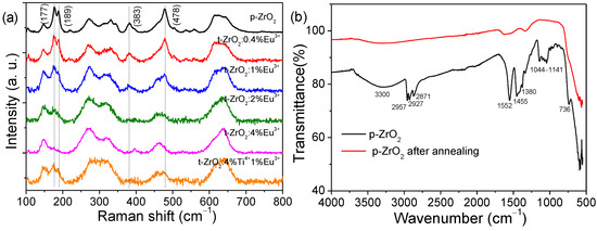 (a) Raman spectra of the as-synthesized NCs (p−ZrO2 and p-ZrO2:xEu3+ (x = 0.4%, 1%, and 4%)); the dashed lines indicate the modes of m-ZrO2; (b) FTIR spectra of p-ZrO2 before and after annealing at 400 °C.