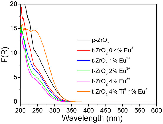 Diffuse reflection–UV–visible spectra of the as-synthesized NCs (p-ZrO2, t-ZrO2:xEu3+ (x = 0.4%, 1%, and 4%)) and t-ZrO2:4%Ti4+, 1%Eu3+.