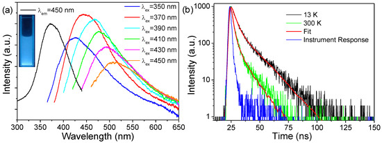 (a) PL excitation and emission spectra of the as-synthesized p-ZrO2 NCs at room temperature; the inset of Figure 5a is the photograph showing the PL of an ethanolic dispersion of p-ZrO2 NCs under 365 nm UV irradiation; a 370 nm long-wave passed filter was used when recording the excitation spectrum, while no optical filter was used when recording the PL emission spectra. (b) 13 K and room temperature fluorescence decay traces of the p-ZrO2 NCs and the fitting with bi-exponential function (λex = 370 nm, λem = 450 nm); the instrument response function (IRF) of the measured system is included (λex = 370 nm, λem = 370 nm).