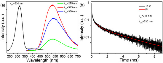 Figure 6a shows the PL excitation and emission spectra of the p-ZrO2 NCs at 13 K. In sharp contrast to the room-temperature PL, there existed an intense shorter-wave UV excitation band covering the 230–360 nm range (centered at 315 nm), which yielded bright broadband white luminescence in the 400–700 nm range (centered at 530 nm) with a large Stokes shift reaching ~13,000 cm−1 and an insignificant excitation-dependent emission. Such an excitation band coincides well with the observed strong absorption in Figure 4, which is, thus, ascribed to CT (O2−→Ti4+) transitions in the titanate groups [9]. Note that the carbon impurities-related excitation was also observed in the range of 360–490 nm by reason of the spectral overlapping of PL emissions [43], but it was much weaker in intensity. In Figure 6b, the fluorescence decay shows a much longer lifetime in the scale of milliseconds. There exists an initial rapid non-exponential component, followed by a much slower component at later times. The rapid component corresponds to the luminescence of carbon impurities discussed above, which was slightly excited by the short-wave UV irradiation at a low temperature, while the slower one arose from the CT (Ti3+→O−) emissions in the titanate groups, of which the long decay times at lower temperatures have been previously observed for Ti4+ in monoclinic hafnia (HfO2) [8], indicating that the emission results from a strongly forbidden transition, presumably a triplet state of a strong spin-forbidden character. The slow component in the trace is clearly two-exponential with the two resolved decay time constants having values of τ1~0.56 and τ2~2.98 ms, which are comparable with previous reports [8].