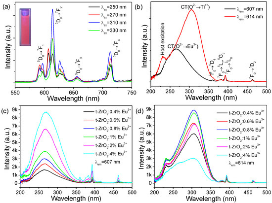 (a) PL emission and excitation (b) spectra of the t-ZrO2:1%Eu3+ NCs at room temperature; the inset of Figure 7a is the photograph showing the PL of an ethanolic dispersion of t-ZrO2:1%Eu3+NCs under 254 nm UV irradiation; (c,d) PL excitation spectra of t-ZrO2:xEu3+ (x = 0.4%, 0.6%, 0.8%, 1%, 2%, and 4%) NCs by monitoring the relative maxima of Eu(I) (7c, λem = 607 nm) and Eu(II) (7d, λem = 614 nm).