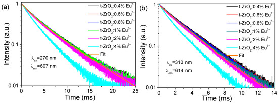 Fluorescence decay traces of t-ZrO2:xEu3+ (x = 0.4%, 0.6%, 0.8%, 1%, 2%, and 4%) NCs by monitoring the relative maxima of Eu(I) ((a), λex = 270 nm, λem = 607 nm) and Eu(II) ((b), λex = 310 nm, λem = 614 nm).