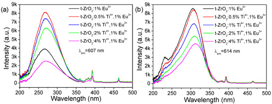 PL excitation spectra of t-ZrO2:xTi4+, 1%Eu3+ (x = 0, 0.5%, 1%, 2%, and 4%) NCs by monitoring the relative maxima of Eu(I) ((a), λem = 607 nm) and Eu(II) ((b), λem = 614 nm).