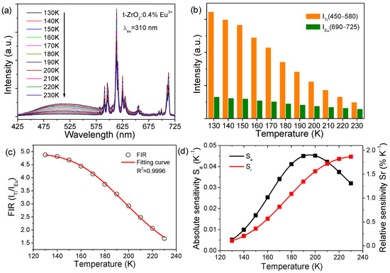 (a) Temperature-dependent PL spectra (λex = 310 nm) of the t-ZrO2:0.4%Eu3+ NCs recorded from 130 to 230 K; (b) temperature-dependent integrated spectral intensity for the titanate group signals (ITi) (450–580 nm) and Eu3+signals (IEu) (690–725 nm); (c) temperature dependence of the experimental FIR (ITi/IEu) values and the fitting curves using Equation (3); (d) absolute sensitivity value Sa and relativity sensitivity value Sr at different temperatures.